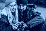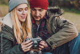 Travel couple camping with camera having fun in the forest. Concept of trekking, adventure and seasonal vacation.
