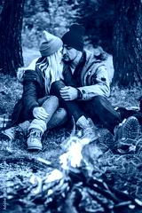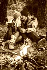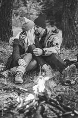 Traveler couple camping in the forest and relaxing near campfire after a hard day. Concept of trekking, adventure and seasonal vacation.