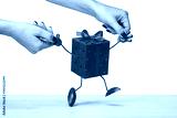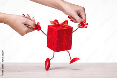 Gift. A box in red packaging steps with legs, holding woman's hands. The concept of holiday and congratulations. Sale, black friday.