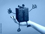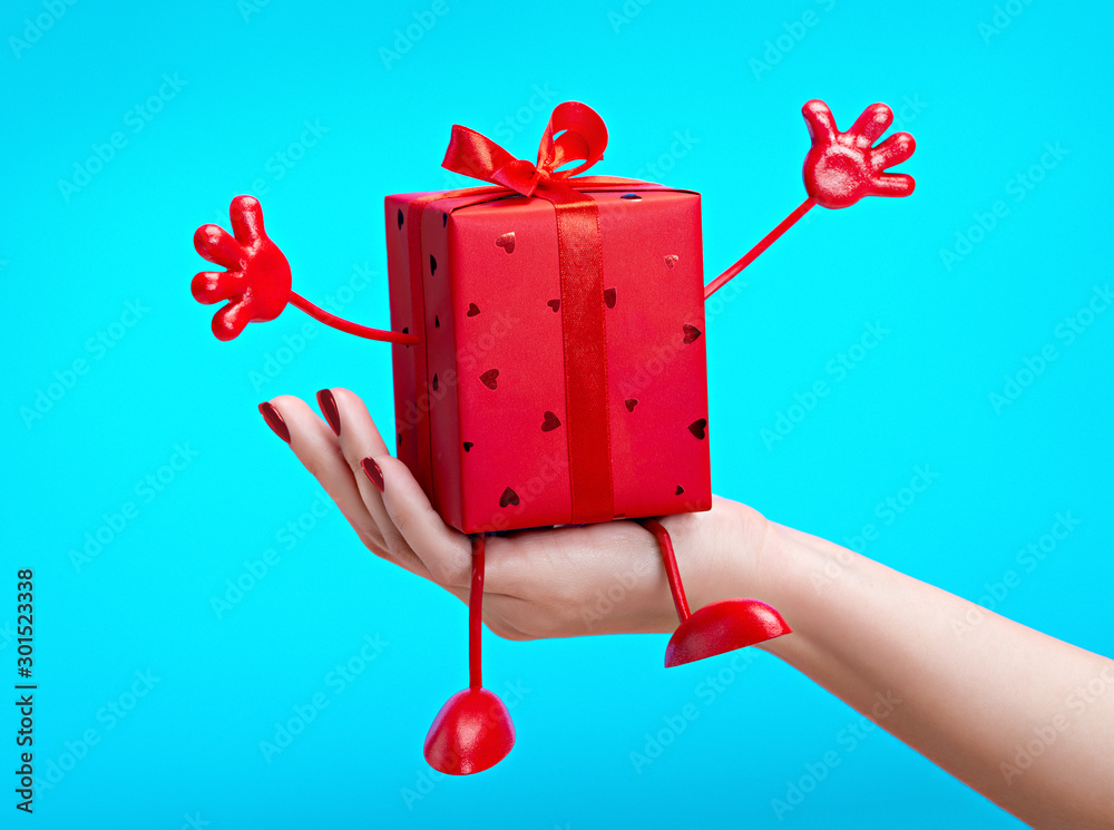 Gift in red box. On woman’s hand is surprise in an elegant box with handles and legs. The concept of holiday and congratulations. Blue background.