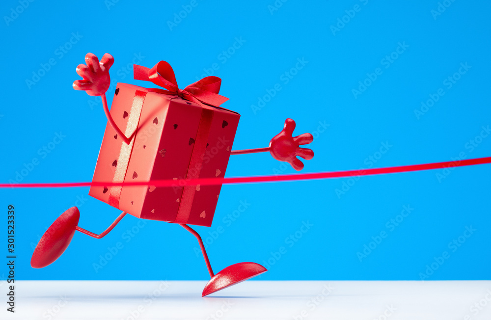 Gift. Box packed in red paper and decorated with ribbon with bow. Final sale. Blue background.