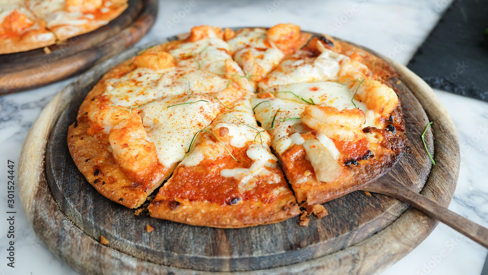Tom Yum Kung pizza with shrimp on top in wooden plate