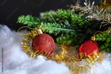 Red ball christmas decoration on rustic table,Christmas background.