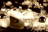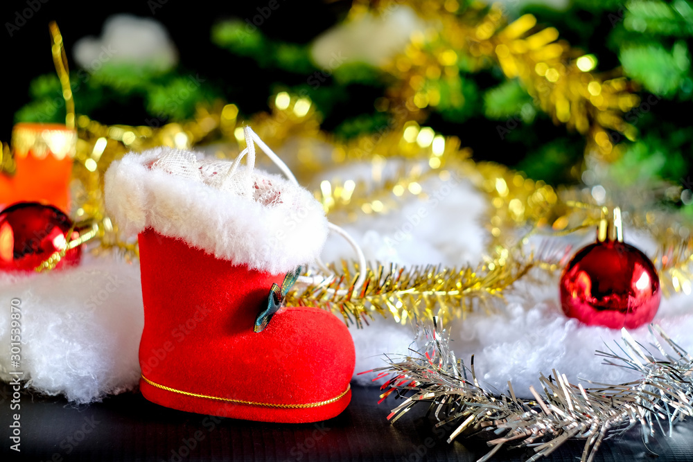Red boot christmas or Santa's shoe on rustic wooden table,Christmas background.