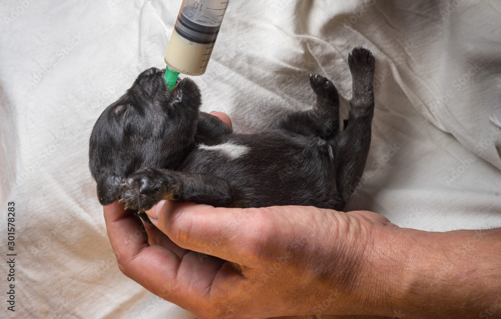 Veterinarian holds a weak puppy in his arms and feeds with bitch milk from a pipette on a syringe. Newborn fed by human hands. The little puppy is one day of age.
