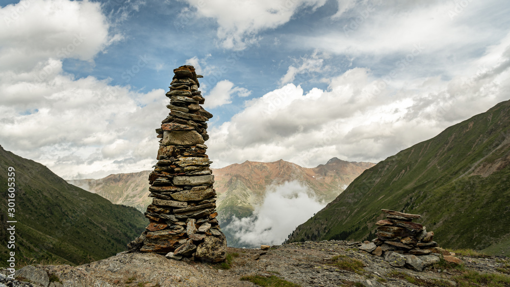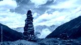 A huge pile of stacked stones in the mountains