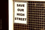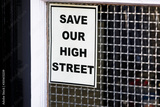 Save our high street sign on closed shop window due to online shopping and recession in the uk