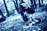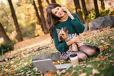 Woman working on laptop and talking on the phone in the park with dog in her arms.