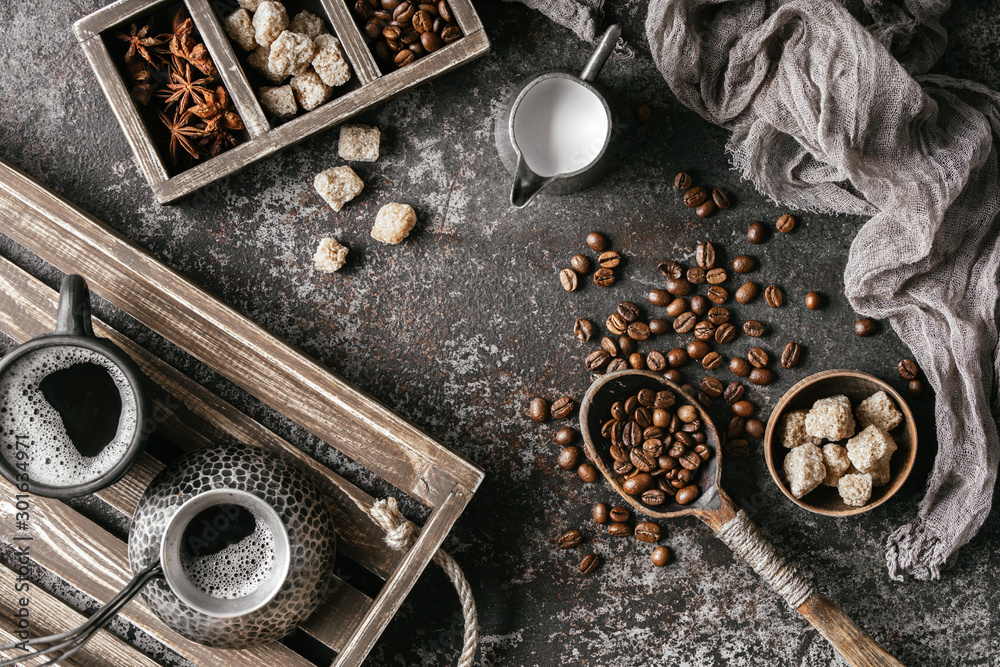 Coffee on wooden tray with coffee beans on dark textured background. Top view with copy space. Background with free text space.