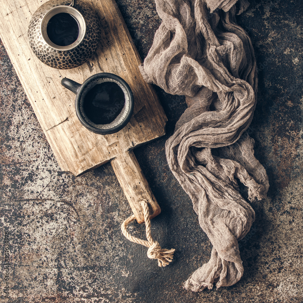 Coffee on wooden board with coffee beans on dark textured background. Top view with copy space. Background with free text space.