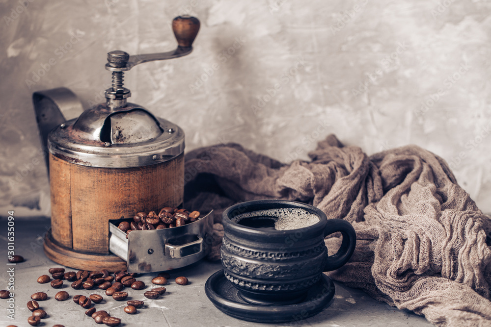 Coffee with coffee beans on grey textured background. Top view with copy space. Background with free text space.