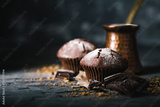 Muffin with coffee on dark textured background.