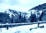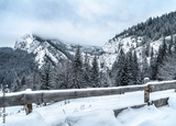 Majestic mountains in winter with white snowy spruces. Wonderful wintry landscape. Amazing view on snowcovered rock mountains. Travel background