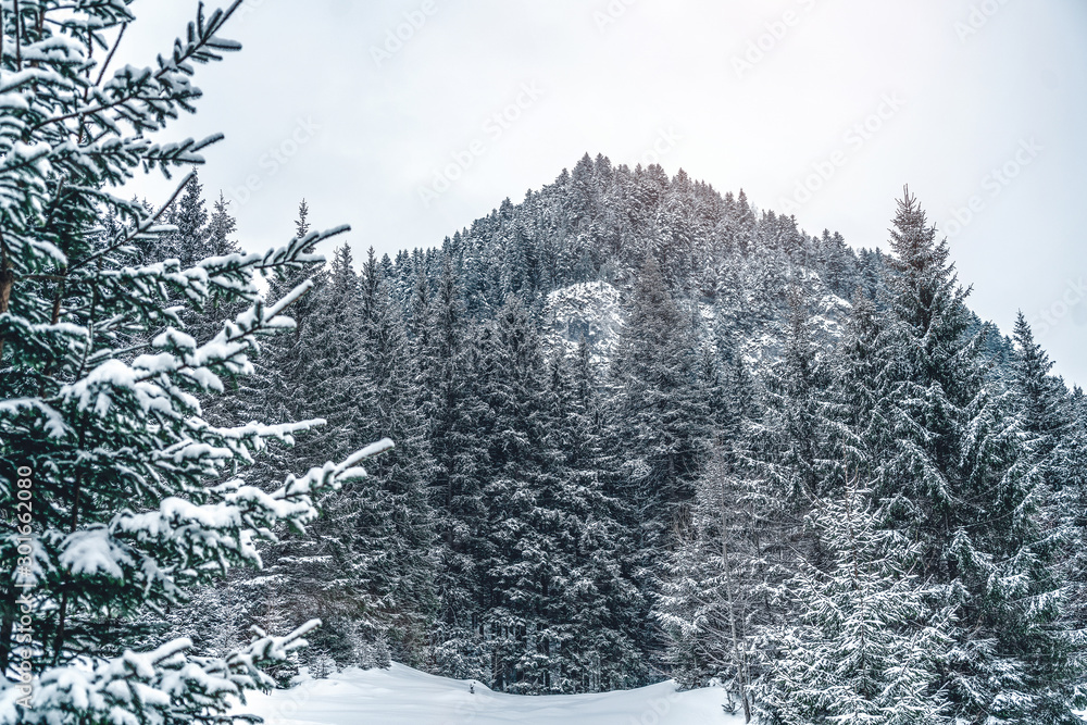 Winter mountains with white snowy spruces. Wonderful wintry landscape. Amazing view on snowcovered forested mountain slope. Tourism concept. Happy New Year