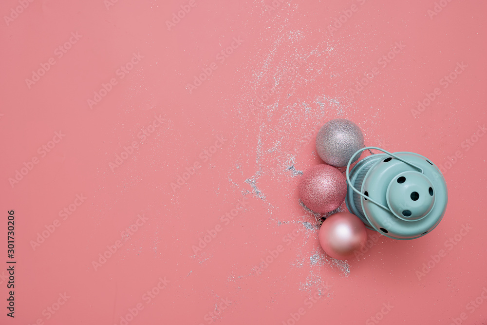 Mint lamp and pink balls. top view christmas flatlay on pink. copy space