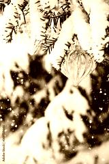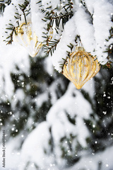 Decorated with golden ornaments Christmas tree on snow background. Merry Christmas and Happy Holidays greeting card. New Year. Noel. Winter xmas theme. Outdoor.
