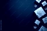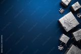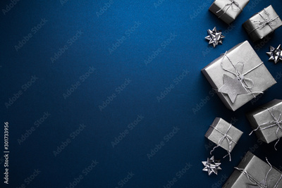 Merry Christmas ornaments and gift on blue background top view. Xmas and new year holiday theme. Flat lay
