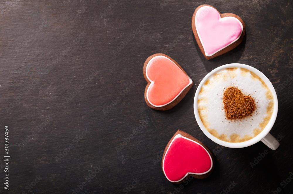 Valentines day. Cup of cappuccino coffee with drawn heart and colorful heart shaped cookies, top view