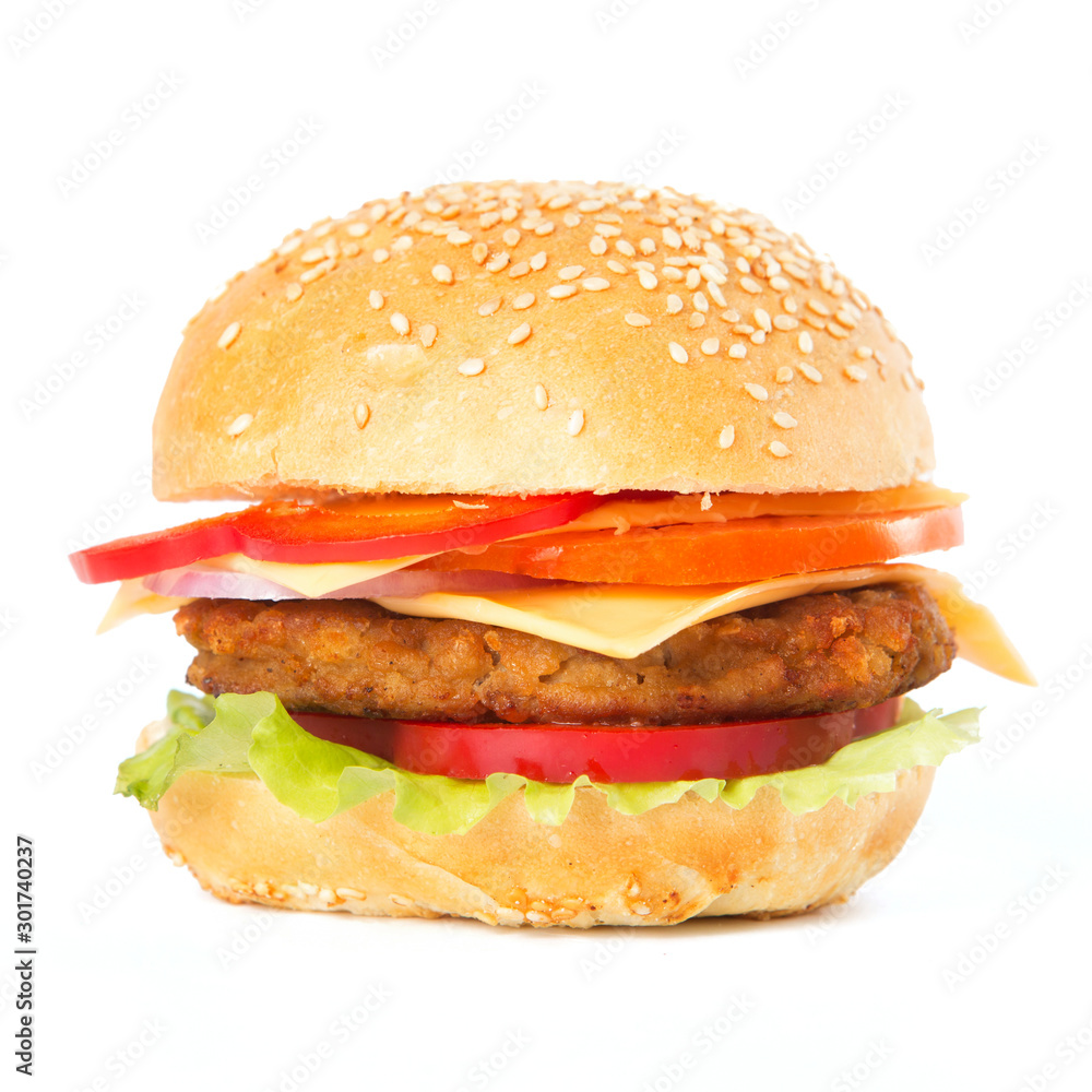 Big hamburger with cheese on white background