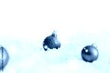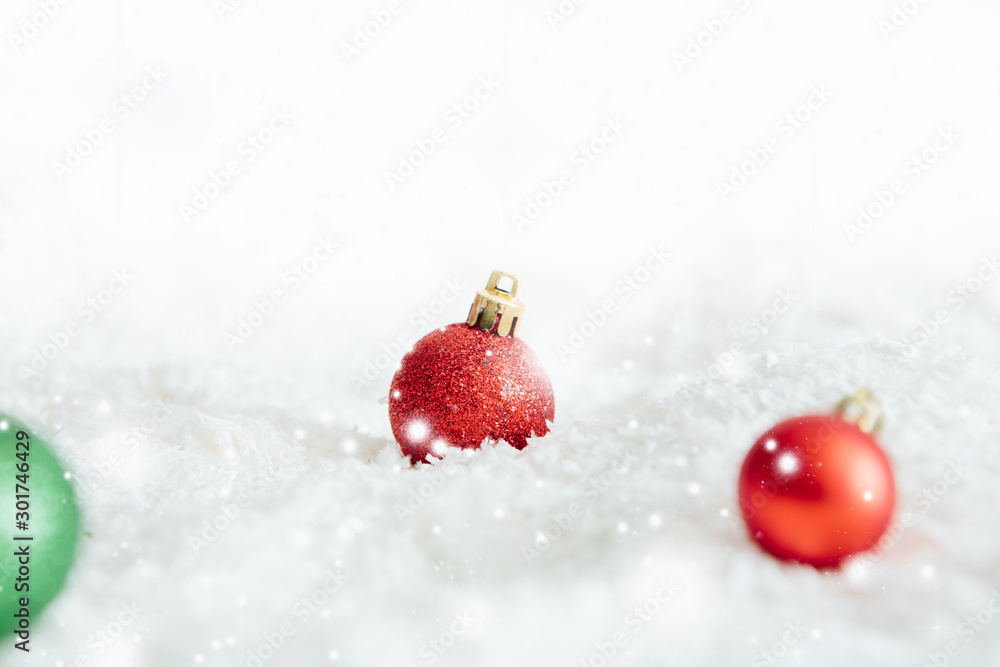 Christmas balls in the snow on white Beautiful Christmas bauble decorations lie on the white fluffy snow. Atmosphere of magic and fairy tales