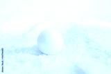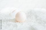 White Christmas ball hanging on red ribbon on snowy winter background Beautiful Christmas bauble decorations lie on the white fluffy snow. Atmosphere of magic and fairy tales