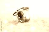 Transparent Christmas ball hanging on red ribbon on snowy winter background Beautiful Christmas bauble decorations lie on the white fluffy snow. Atmosphere of magic and fairy tales