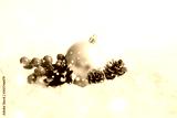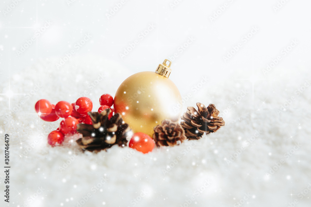 Christmas gold ball on abstract background Beautiful Christmas bauble decorations lie on the white fluffy snow. Atmosphere of magic and fairy tales