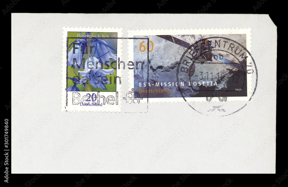 Briefmarken stamps Deutschland gestempelt Blume Esa Mission Rosetta Hasenglöckchen blau Satellit Weltall