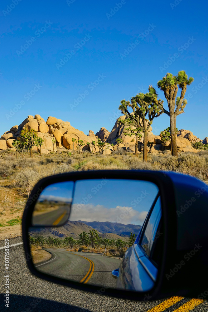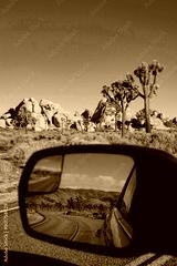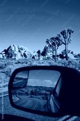 VERTICAL: Car's side mirror offers a stunning view of Joshua Tree National Park