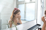 Close up of Smile woman with makeup brushes near face and look mirror. asian beauty