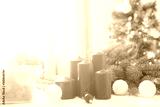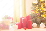 Several red christmas candles on white wooden plank against christmas tree in living room