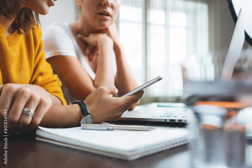 Team of young business woman have meeting in modern office. Two female manager using laptop at workplace at office