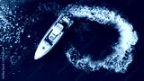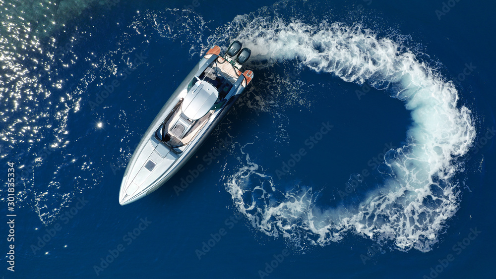 Aerial drone top down photo of luxury rigid inflatable power boat or RIB boat manoeuvring in high speed in open ocean deep blue sea