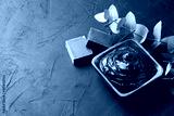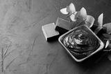 Spa and bath concept. Dead sea mud, coal black soap, eucalyptus on black background. Copy space.
