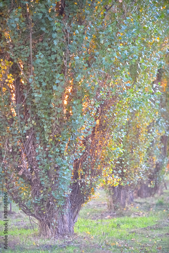 alley of white pyramidal poplars (Populus) at sunset in autumn