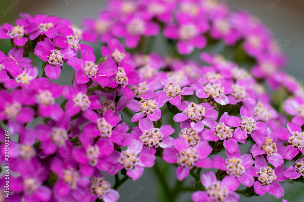 Inflorescence of small flowers of pink yarrow. Macro mode. Selective focus.