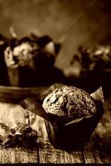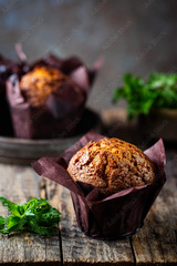 Homemade fresh baked carrot muffins with hazelnut and orange on wooden background