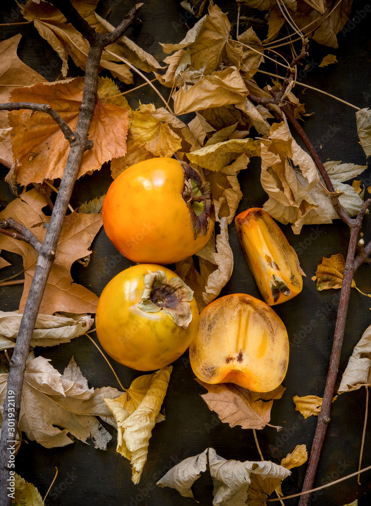 Autumnal background with dried leaves and yellow persimmons