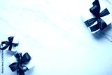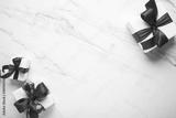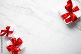 Christmas and New Year holiday background. Xmas greeting card. Christmas red ribbon gifts and ornaments on white marble background top view.