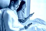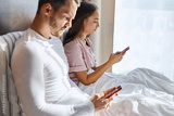 Close up of pretty attractive woman sitting on bed, covered with blanket, holding cell phone, chatting with interest, staring at screen, ignore live communication, family portrait