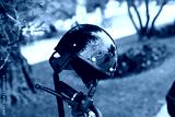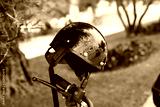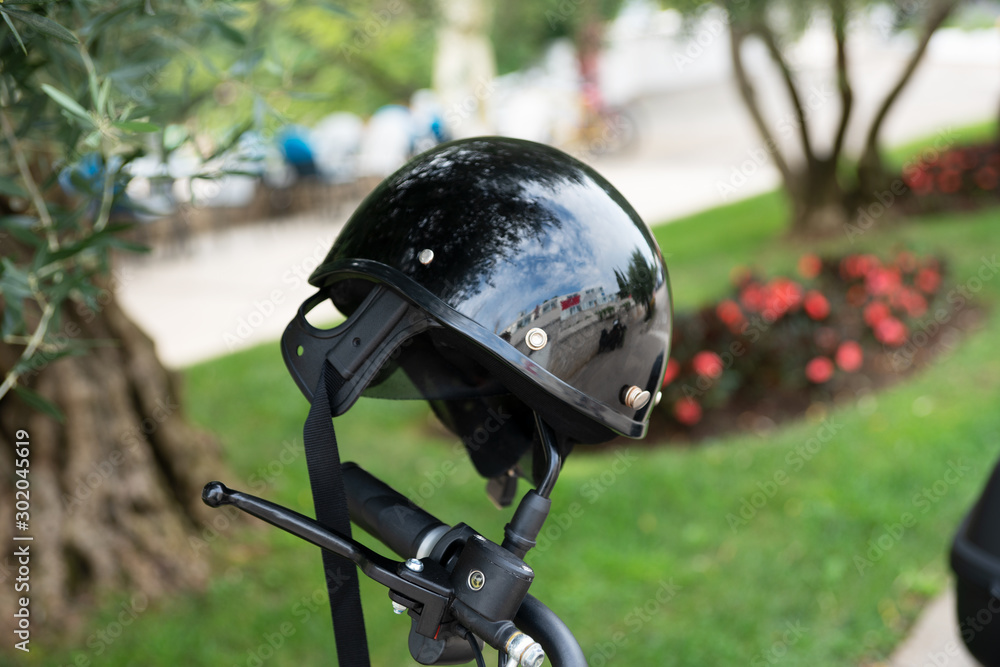 A protective helmet hangs on the rearview mirror of the electric scooter. Selective focus.