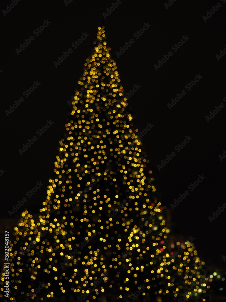 Silhouette of blurry Christmas tree illuminated and decorated with golden fairy lights in dark night creating beautiful bokeh effect with glowing circles or shiny dots, abstract image for holiday card
