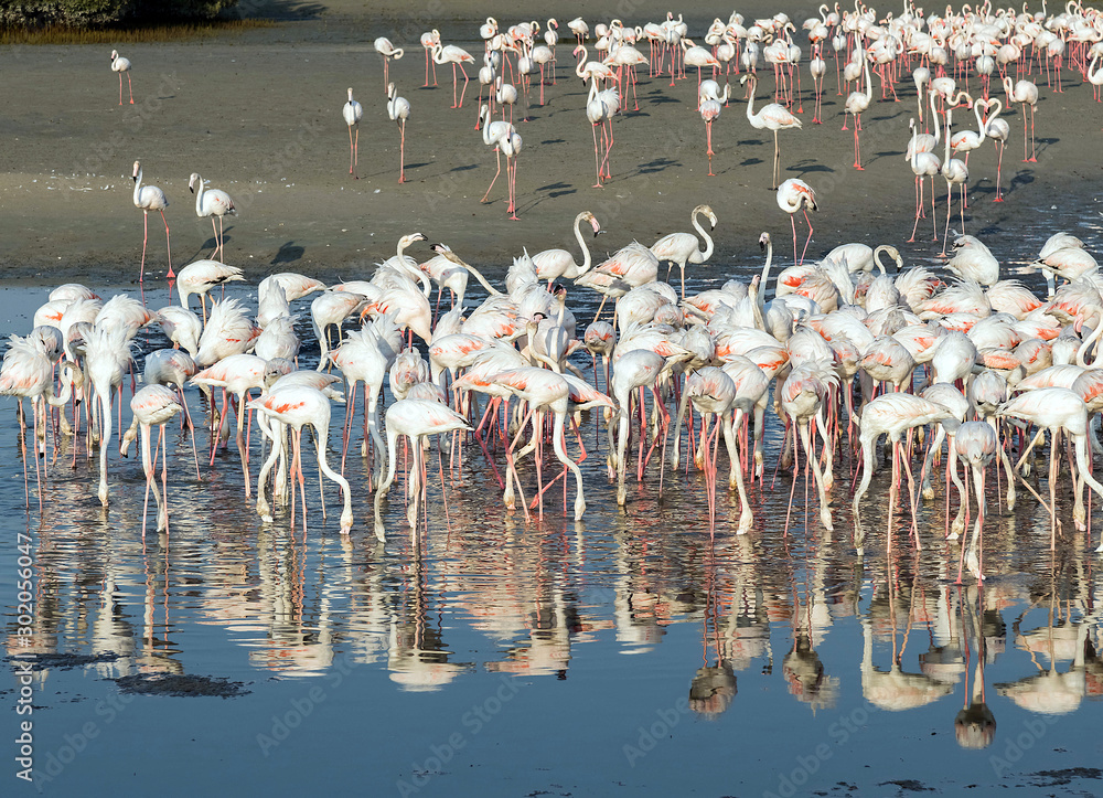Caribbean pink flamingo at Ras al Khor Wildlife Sanctuary, a wetland reserve in Dubai, United Arab Emirates,