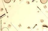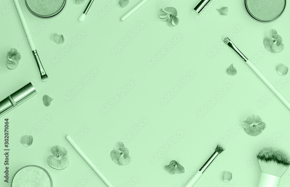 Flat lay composition with decorative makeup products and flowers on trendy mint background. Copy space.