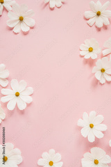 Minimal styled concept. White daisy chamomile flowers on pale pink background. Creative lifestyle, summer, spring concept. Copy space, flat lay, top view.
