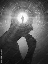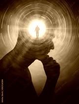 A silhouete of a man with rays of light emanating from the brain as a symbol of the power of thinking. Concept on the topic of psychiatry (bipolar disorder, schizophrenia), psychology etc..