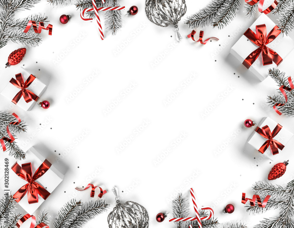 Creative frame made of Christmas fir branches, gift boxes, red decoration, sparkles and confetti on white background. Xmas and New Year holiday, bokeh, light. Flat lay, top view