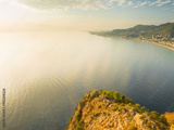 Alanya, Turkey. Beautiful view from the fortress Alanya Castle of the Mediterranean Sea and Cleopatra beach at sunset. Vacation postcard background