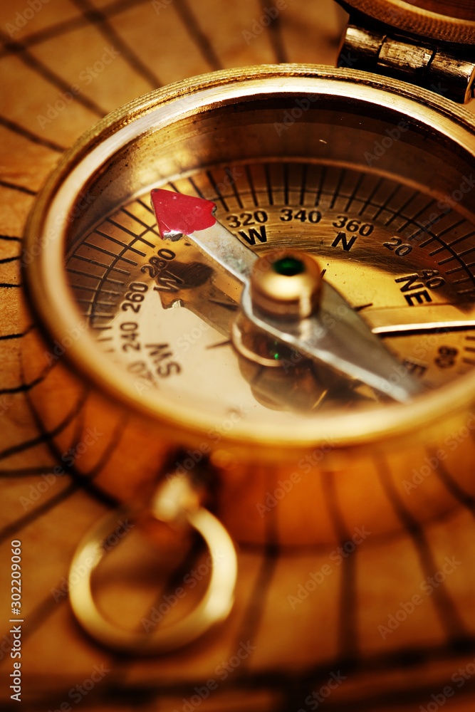 Old vintage retro compass on ancient map background. Travel geography navigation concept background.