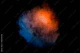 Orange blue powder explosion on black background.Orange blue color dust splash clouds.